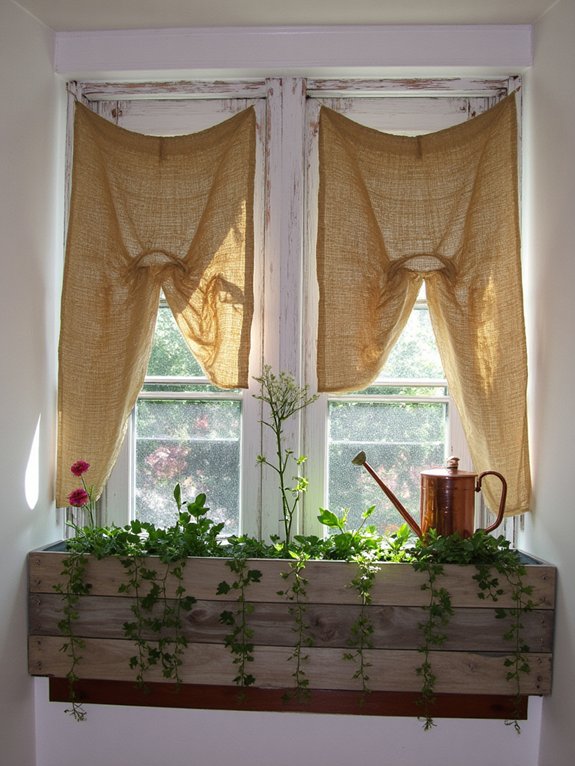 Transform a plain window box into a rustic accent piece by draping natural burlap fabric over a wooden container mounted beneath your window. The fabric’s generous overhang creates soft folds while decorative tacks add visual interest and secure the material in place.