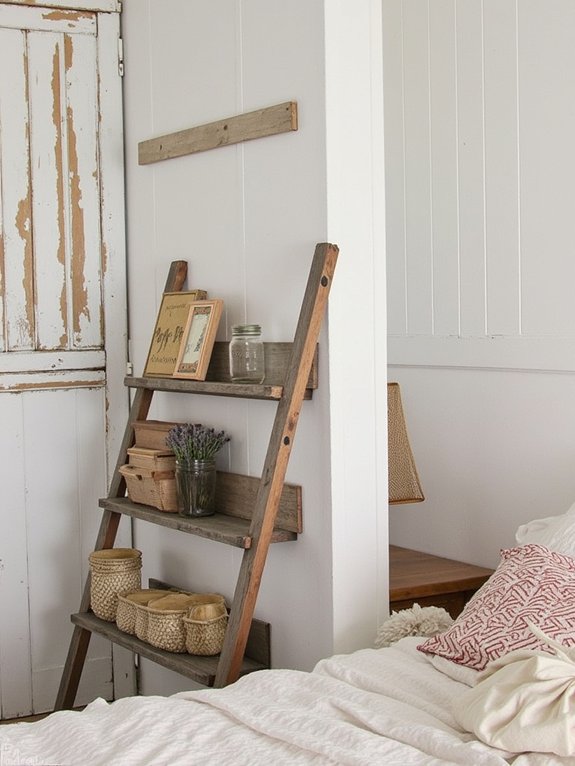 Vintage wooden ladders can be reimagined as versatile vertical shelving units that maximize wall space while adding rustic character to any bedroom. When mounted horizontally with proper support brackets, these repurposed pieces create an attractive storage solution for everyday items.