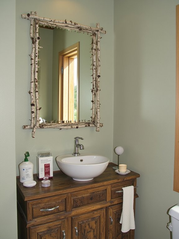 Branch-framed bathroom mirrors merge natural elements with functional design, creating a distinctive woodland accent piece for the bathroom. The rustic wooden frames, crafted from carefully selected and treated branches, transform ordinary mirrors into striking focal points while maintaining their practical purpose.