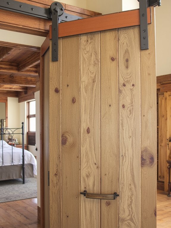 Leather-wrapped steel door handles combine rustic charm with practical functionality. The natural leather covering provides a warm, tactile experience while protecting against cold metal surfaces, seamlessly integrating both form and function into bedroom entryways.