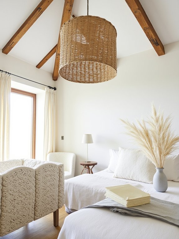 For optimal performance, these fixtures work best when sized 18-24 inches in diameter and hung 24-30 inches above surfaces like bedside tables. Natural tan or whitewashed finishes complement existing wood elements, while warm LED bulbs between 2700K-3000K enhance the wicker’s texture and create an inviting atmosphere.