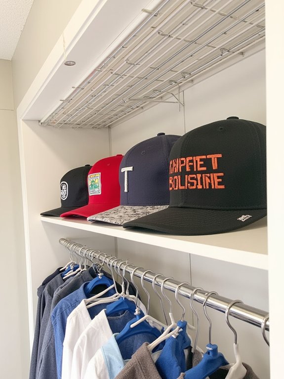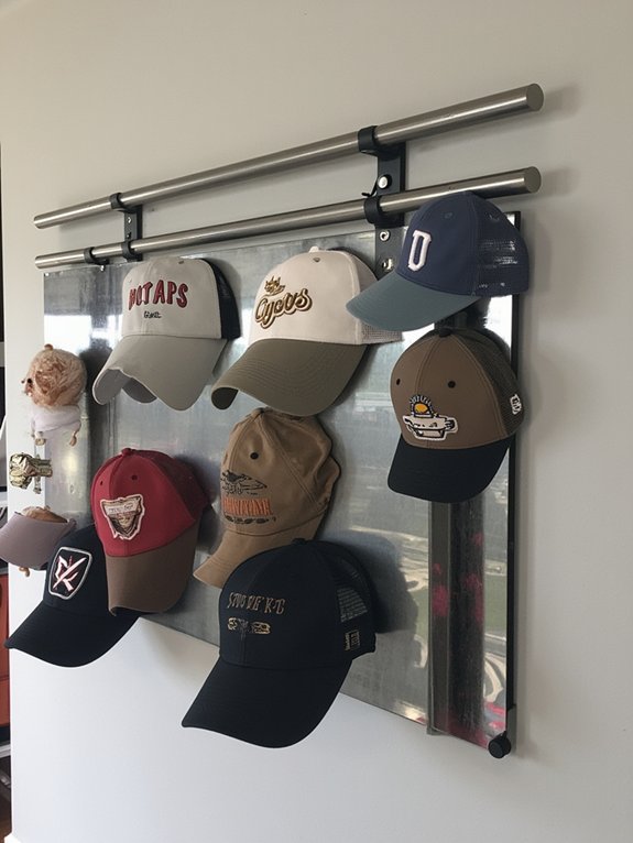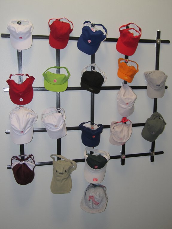 Tension rods mounted horizontally between walls or inside closets provide an effective way to display and store cap collections. By installing multiple tiers of adjustable rods spaced 8 inches apart, you create organized storage that keeps caps visible and maintains their shape.