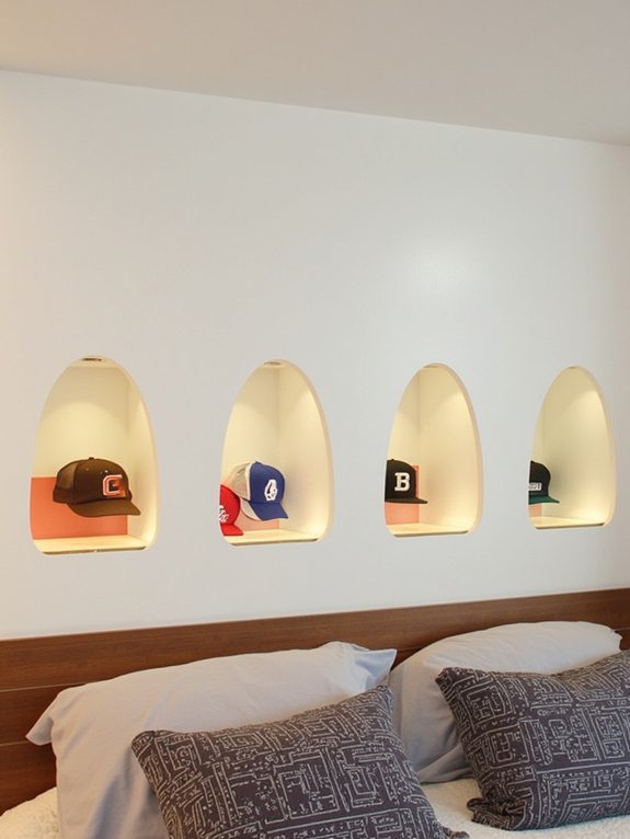 Cap-shaped wall niches provide a distinctive architectural storage solution that mirrors the silhouette of baseball caps. These built-in wall cavities create an eye-catching showcase for headwear collections while serving as both decorative elements and functional storage spaces.