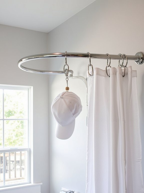 A tension shower rod mounted between walls creates a practical storage solution for displaying and organizing caps. By installing the rod at eye level, caps become easily accessible while utilizing vertical space efficiently.