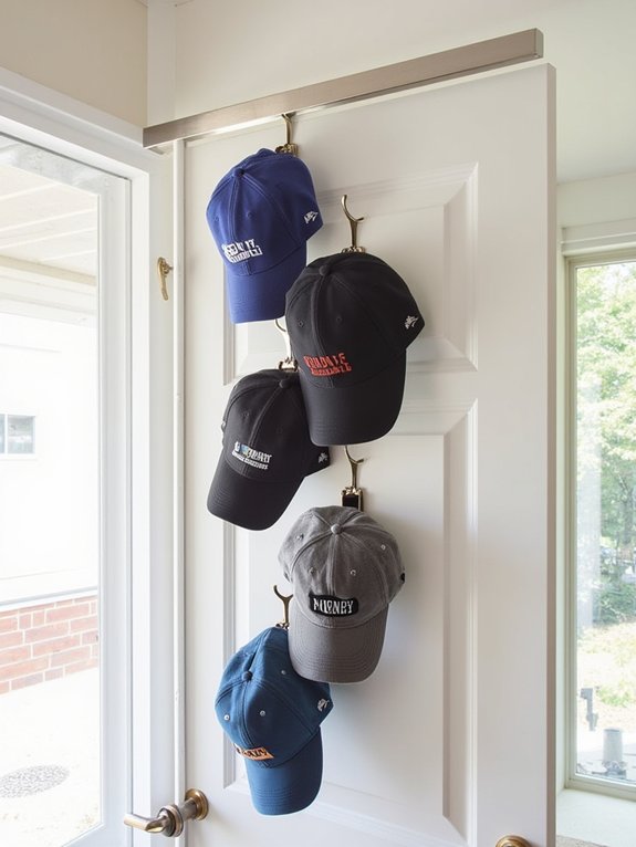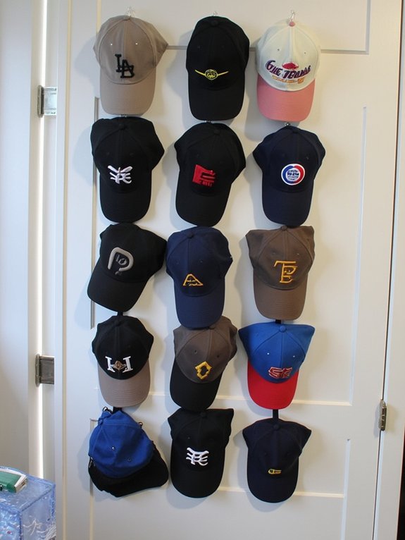 The hooks are designed to hold multiple caps while preserving their shape, with most systems accommodating 3-4 caps per hook. Installation is quick and tool-free, typically using clear plastic hooks that protect the caps from damage. These versatile systems can be mounted on any door in the home, from bedrooms to closets, offering convenient access to your cap collection.