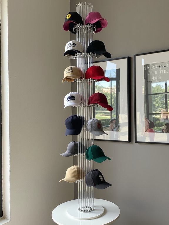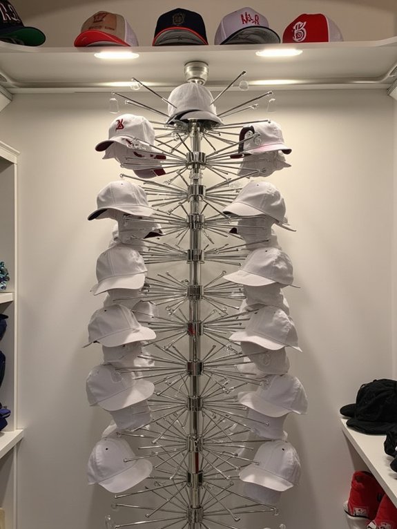 The cap-holding closet carousel rack is a rotating storage system that attaches to standard closet rods, transforming unused vertical space into organized cap storage. It features multiple tiers spaced 3 inches apart to accommodate up to 24 caps while preserving their shape and protecting them from dust.