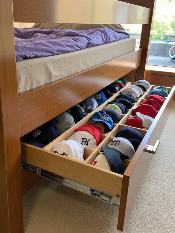 Under-bed cap storage drawers provide a space-efficient solution for organizing hat collections. These sliding containers fit beneath bed frames, protecting caps from dust while utilizing otherwise wasted space. The drawers feature specialized compartments that maintain cap shape and structure.