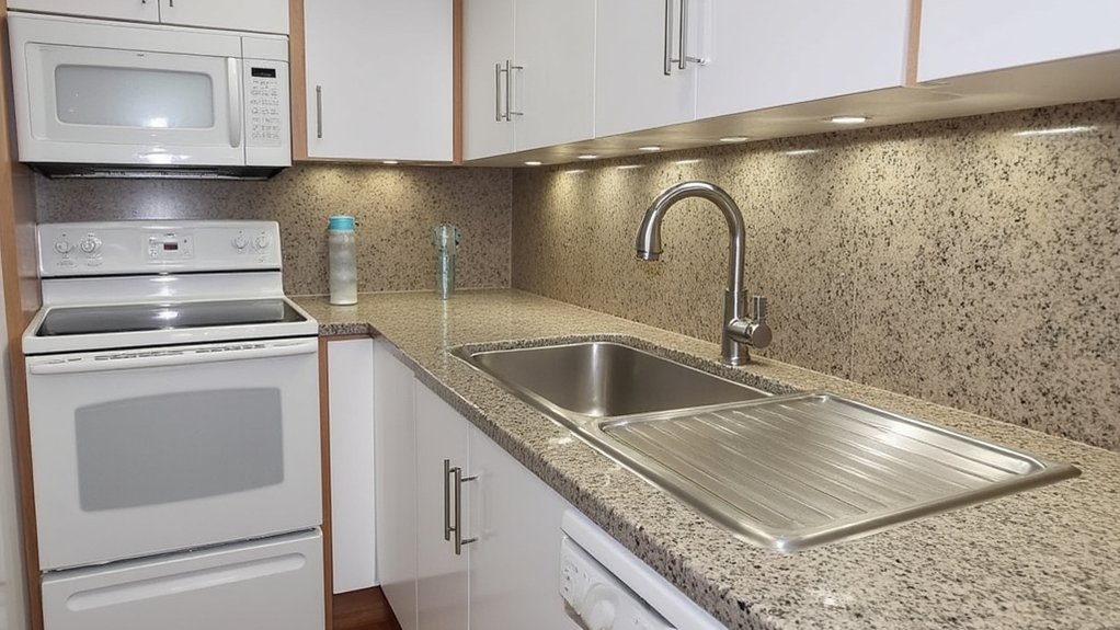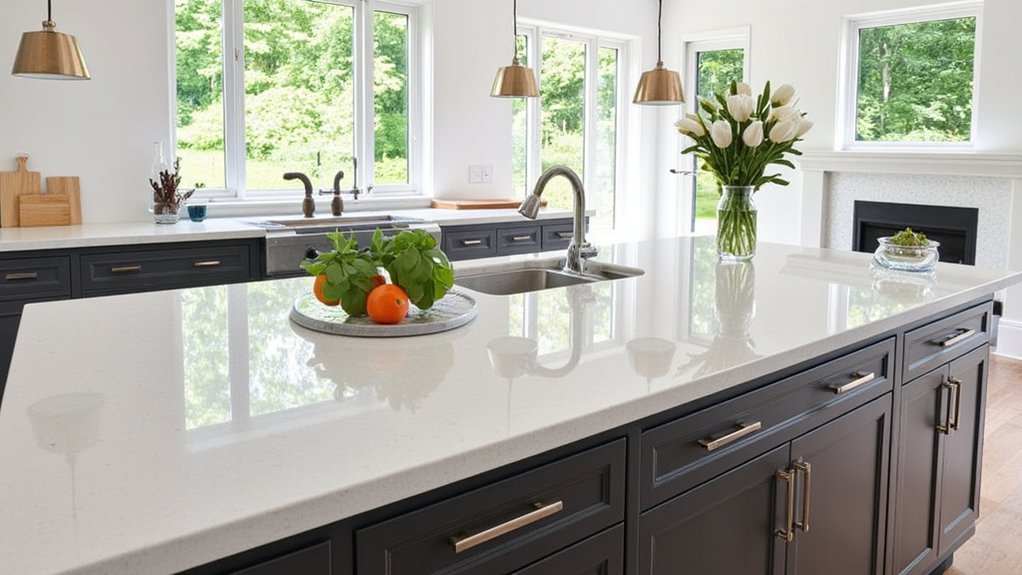 Moving on to sustainable countertop materials, you can revamp your kitchen with eco-friendly options that last. You’re not just choosing style; you’re investing in durability and planet-friendly designs for a 10- to 15-year lifespan. Let’s explore top choices.