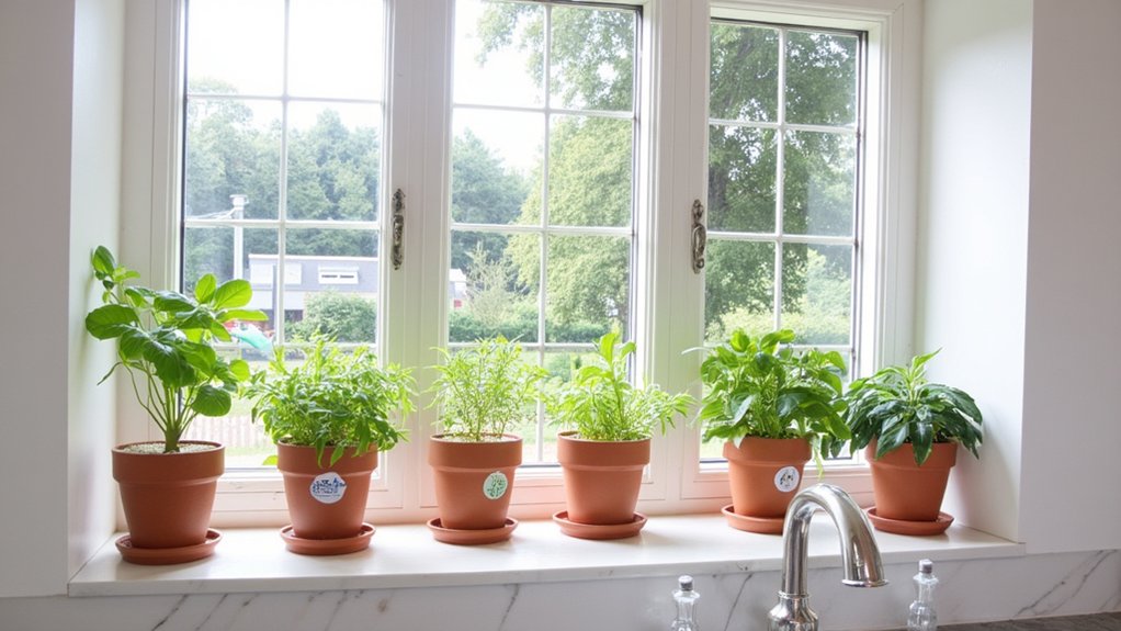 How can you bring fresh flavors right into your kitchen space with minimal effort? Consider integrated herb garden windows! These clever designs turn your kitchen window into a mini greenhouse, letting you grow basil, mint, or thyme year-round. Install a 24-inch wide, 12-inch deep shelf just below the sill for pots.