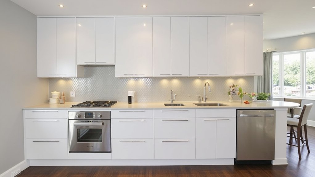 While designing your kitchen, consider starting with minimalist cabinet design to create a clean, uncluttered look. You’ll love how it maximizes space and keeps things tidy with simple lines and neutral colors. Focus on functionality by choosing cabinets no deeper than 24 inches for easy access.