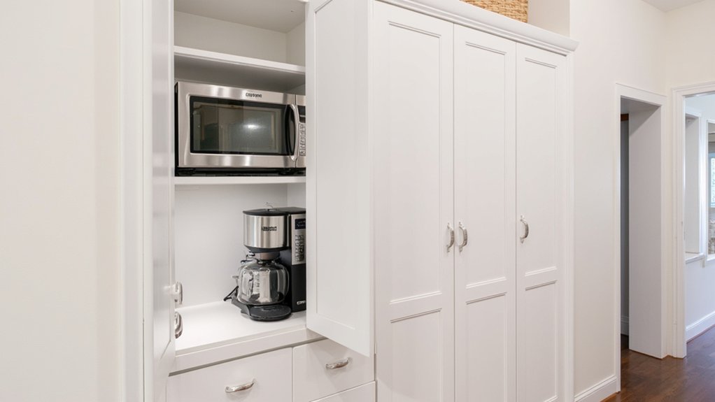 - Sliding Panels: Install panels (36” wide) over a 24” deep nook for small appliances; they slide open in 2 seconds.