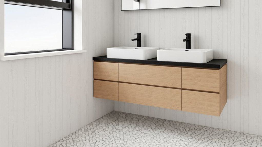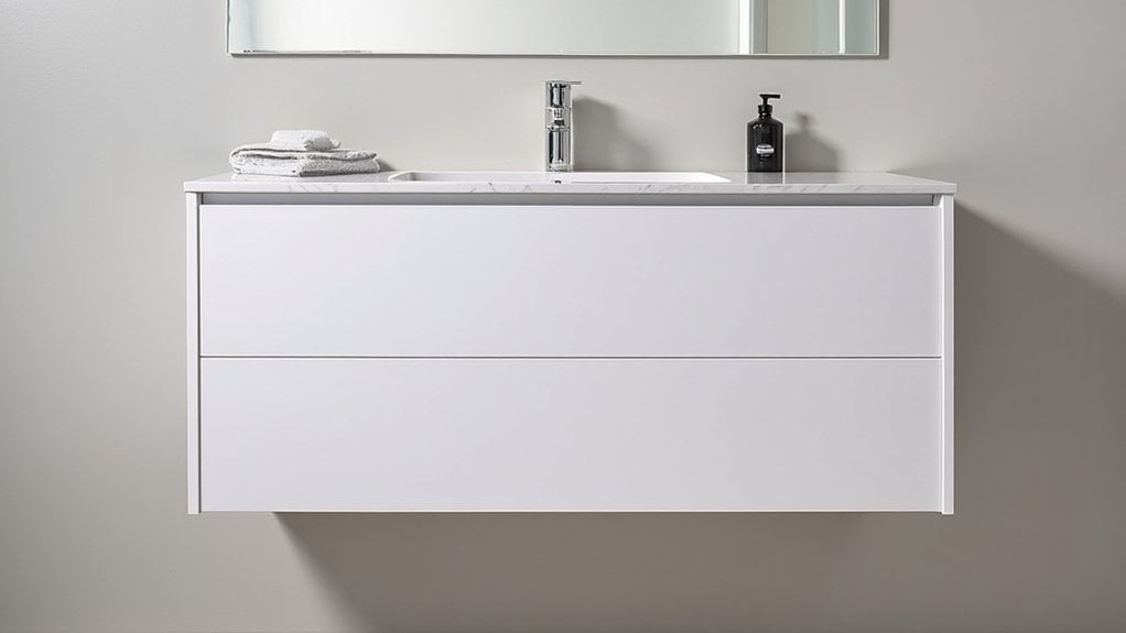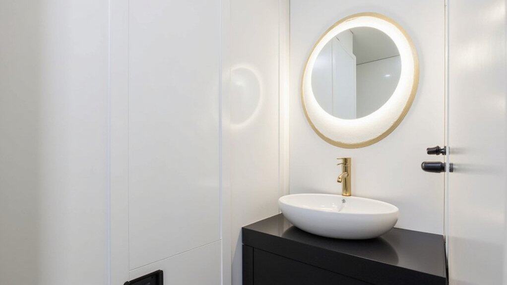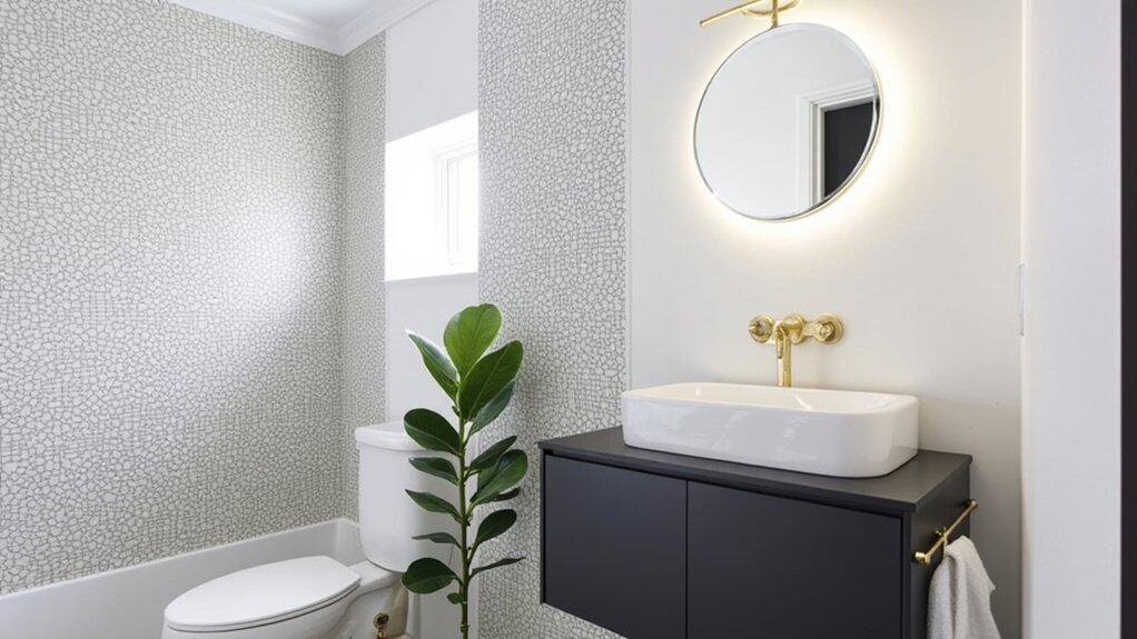 Consider a sleek wall-mounted vanity to elevate your compact powder room with style and function. It’s a smart choice for small spaces, saving floor area while looking modern. Typically, these vanities measure about 24-36 inches wide and 18-22 inches deep, fitting snugly on your wall.
