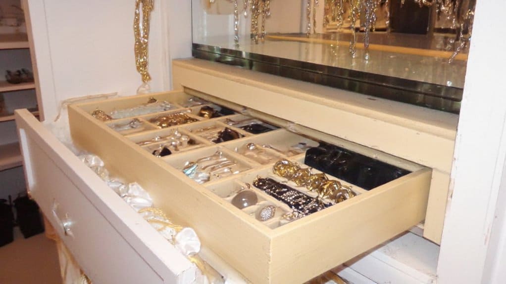 To build your custom organizer, repurpose a shallow drawer or a section of your closet wall by adding velvet-lined compartments or small boxes for delicate items to prevent scratching. Install hooks or a hanging rod for longer necklaces to avoid tangling, and use stackable trays for earrings and rings to maximize vertical space. For a polished look, make sure everything is within reach and visible by arranging items by type or frequency of use, making your daily routine more efficient.