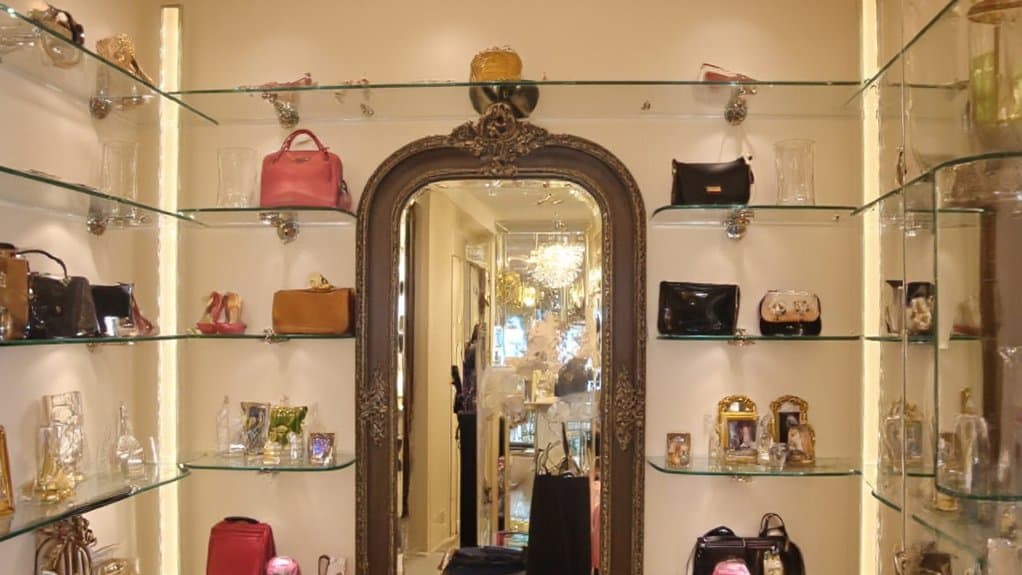 Glass display shelves offer a stylish and elegant way to organize and showcase items in a walk-in closet, turning functional storage into a visual centerpiece. Ideal for displaying designer shoes, handbags, or curated accessories, these shelves keep prized possessions visible and easily accessible while protecting them from dust. To start, install tempered glass shelves at eye level or above for safety and aesthetic appeal, guaranteeing they are securely mounted to support the weight of your items.