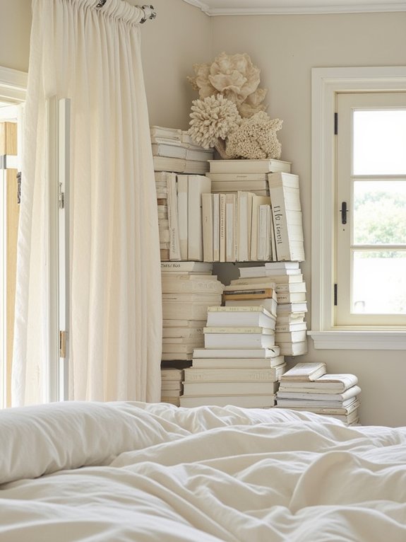 Create a charming reading nook with a thoughtfully curated collection of beach-inspired books. Stack hardcover volumes with blue and white spines in varying heights, anchored by seashell or driftwood bookends that enhance the coastal theme.