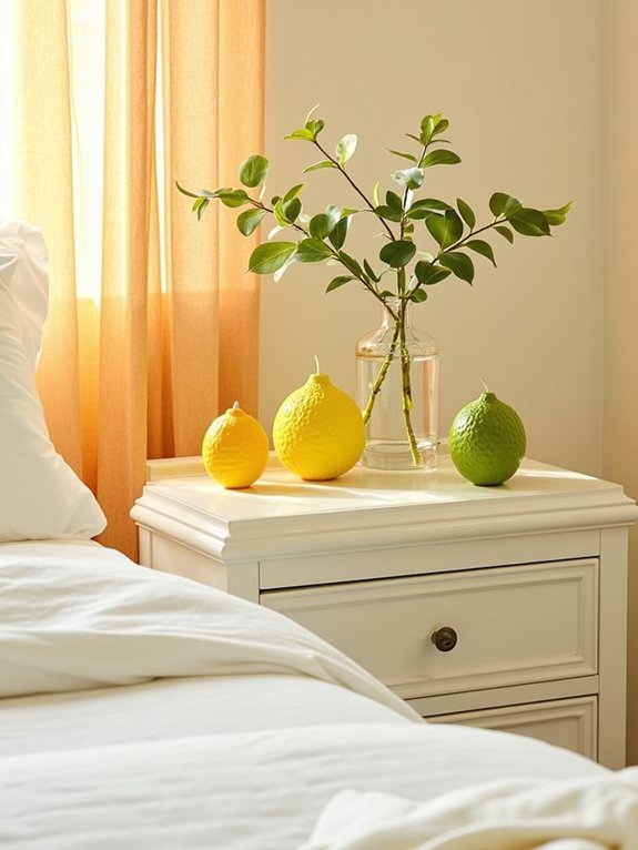 Fresh citrus-scented candles can enhance your bedroom’s summer ambiance through their invigorating fragrances. Research indicates that citrus scents elevate mood and energy while creating a welcoming atmosphere in your space.