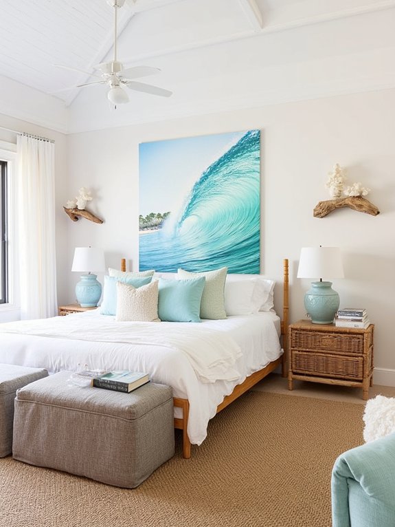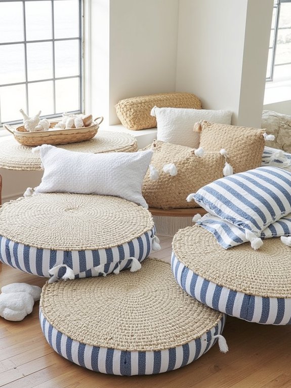 Woven floor cushions made from natural materials like jute, seagrass, and cotton rope create a relaxed beachside atmosphere in any bedroom. These 24-inch square cushions in coastal colors such as sandy tan and ocean blue offer comfortable casual seating while complementing seaside-inspired decor.