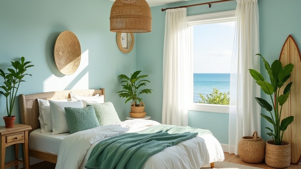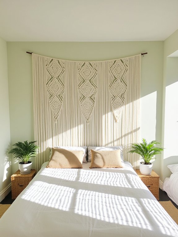 A macrame wall hanging adds natural texture and coastal charm to bedroom decor through woven patterns and artistic knotwork. Using natural cotton cord in neutral tones like cream or white creates a classic beachy aesthetic that works well above beds or on accent walls.
