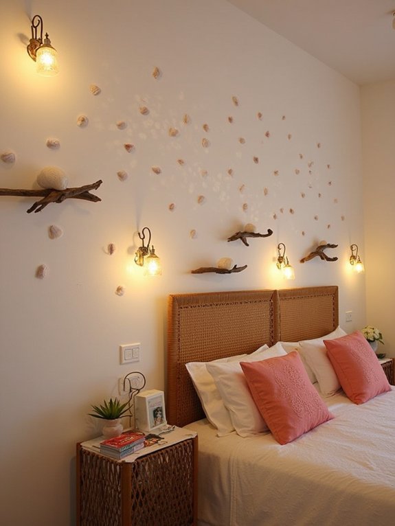 The lights can be arranged at varying heights using conch or nautilus shells, each emitting a warm, golden radiance that’s adjustable via dimmer switches. When complemented with other coastal decor elements like driftwood and sea glass, these luminous shells complete the perfect oceanside retreat atmosphere in your personal space.