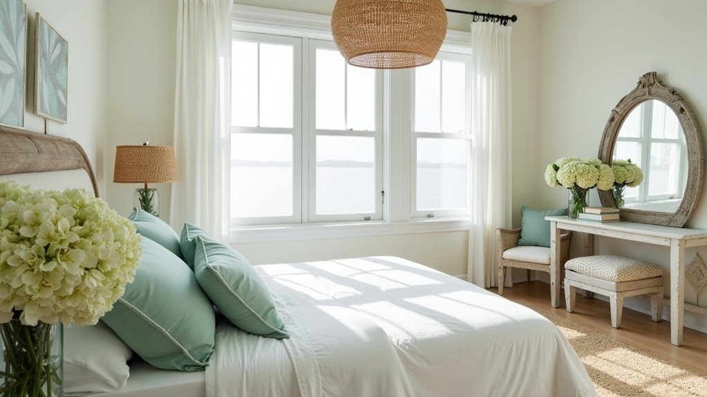 The layering of coastal-inspired textiles creates an airy, relaxed atmosphere without excess weight. Cotton throws featuring subtle stripes or weathered patterns add visual interest while maintaining the room’s breezy feel. These durable yet refined fabric choices bring the refreshing essence of seaside living into the bedroom space.