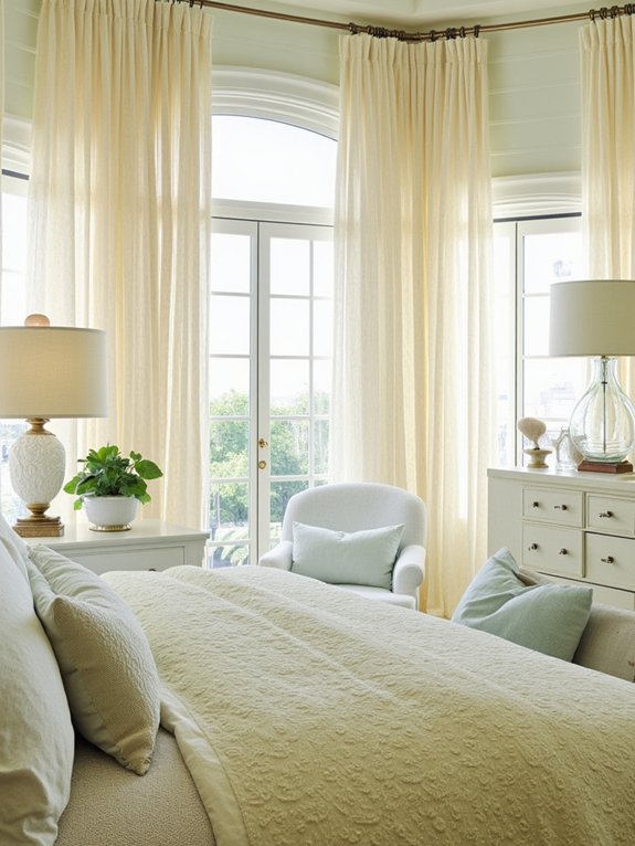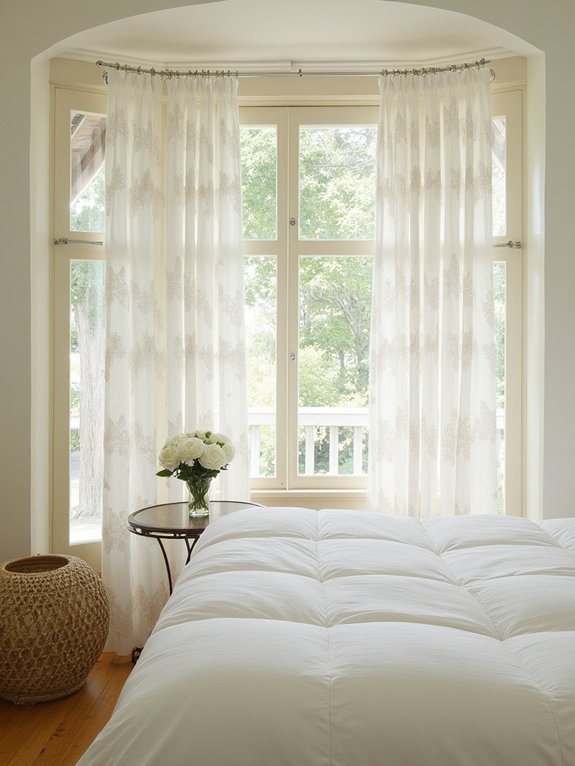 Airy white lace curtains transform a bedroom into a summer sanctuary while balancing beauty and function. The delicate patterns filter sunlight and maintain privacy, creating enchanting shadow play throughout the day.