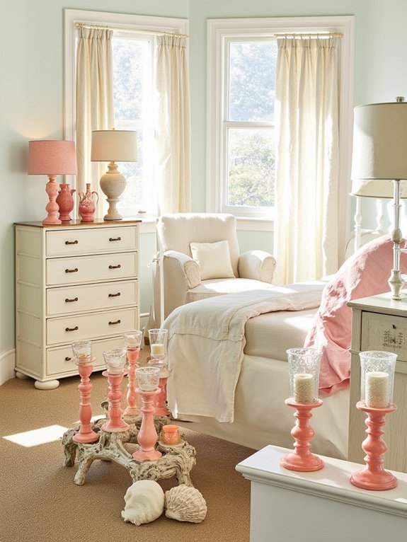 Coral-tinted glass votives enhance summer bedroom decor with their warm glow and sea glass-inspired aesthetic. When arranged in small groupings, these delicate accessories create an enchanting coastal ambiance while maintaining subtle sophistication.
