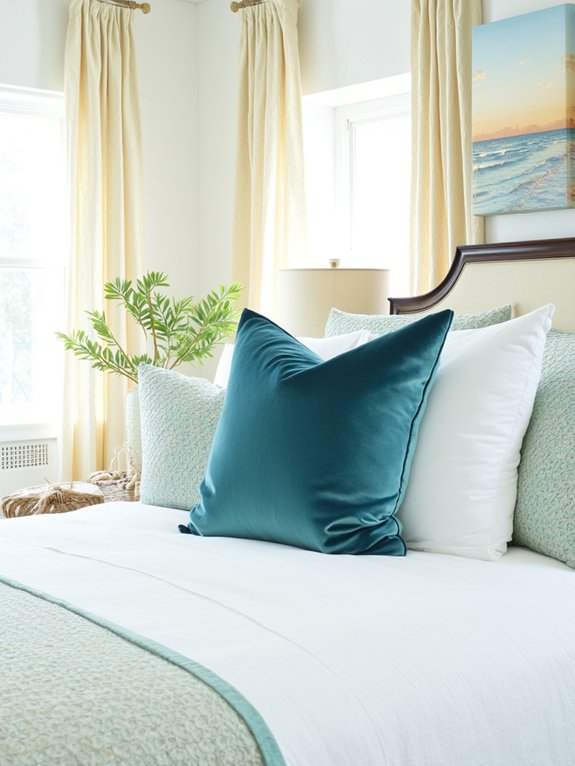 These 18-inch square pillows can be layered in varying shades of aqua, from light seafoam to rich turquoise. When paired with different textures like linen or cotton, they create a dynamic visual and tactile experience that transforms ordinary spaces into tranquil retreats reminiscent of oceanside sanctuaries.