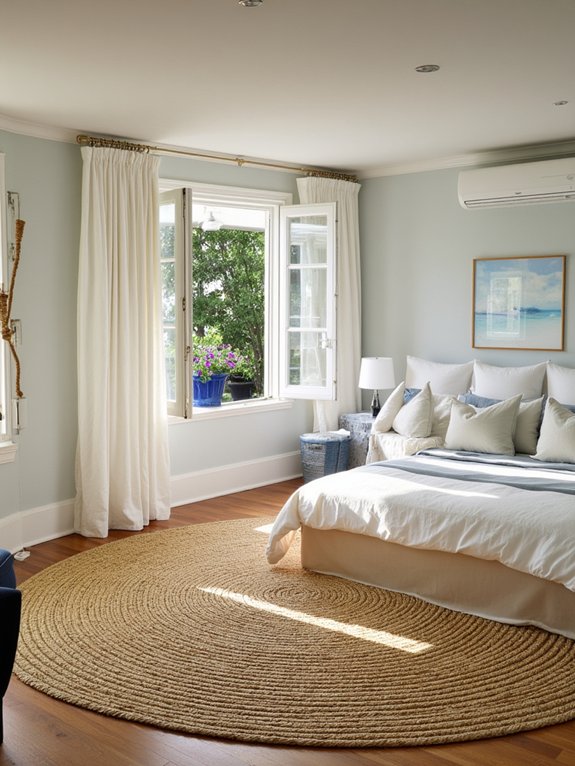 Jute area rugs add natural coastal texture and casual elegance to summer bedrooms while offering practical benefits. The dense weave provides durability and sound absorption, while natural color variations help conceal tracked-in sand and dirt.