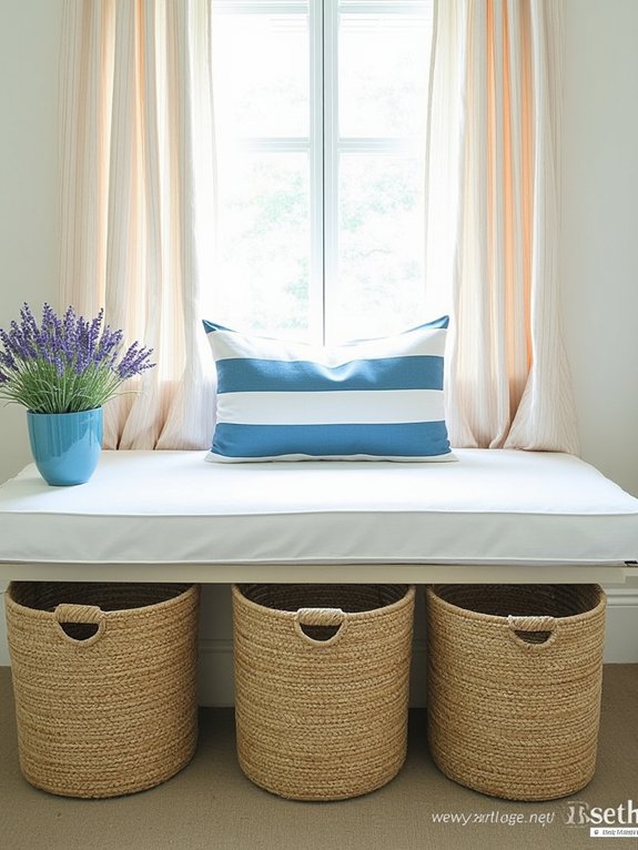 Natural seagrass storage baskets combine practical organization with coastal-inspired style in bedroom decor. These durable containers provide natural ventilation for stored items while adding organic texture to any space. Available in various sizes from 6 to 24 inches, they accommodate everything from small accessories to extra bedding.