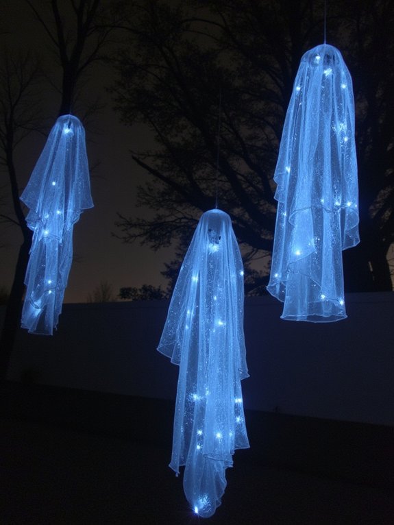 Floating Ghostly Figures create an eerie Halloween display using basic household materials. By combining white sheets, wire frames, and glow sticks, these ethereal apparitions appear to hover mysteriously in the night air. The simple construction takes about two hours and transforms any outdoor space into a haunting scene.