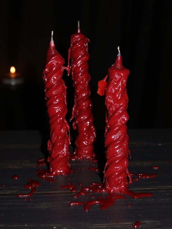 The crafting process requires careful heating of the red wax and strategic placement of drips and metal accents. When displayed on a tray, these macabre decorations produce dramatic shadows and an unsettling ambiance, making them perfect centerpieces for horror-themed events or spooky seasonal displays.
