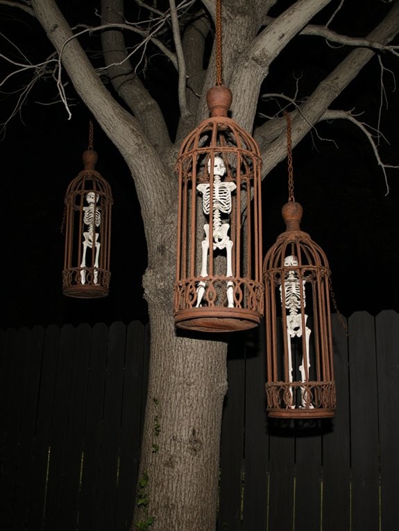 The cages typically house 3-5 foot plastic skeletons within 4-foot mesh enclosures, secured with strong mounting hooks. Assembly requires basic tools and roughly two hours to complete, making them an accessible yet dramatic addition to any Halloween scene. The weatherproof materials ensure the display remains intact throughout the season.