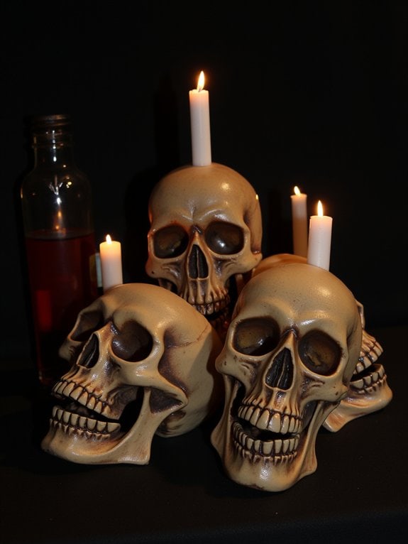 Moving from the charm of Pumpkin Candy Holders, many find an eerie allure in crafting a Skull Candle Display for Halloween. This setup creates a dungeon-like vibe with flickering lights, perfect for spooky gatherings.