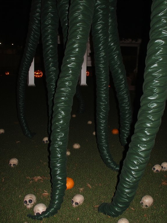 Create an otherworldly backyard display with a towering tentacle monster made from everyday materials. This eye-catching Halloween decoration uses painted pool noodles arranged to mimic writhing tentacles emerging from a wooden base, complete with bottle cap suction cups for added realism.