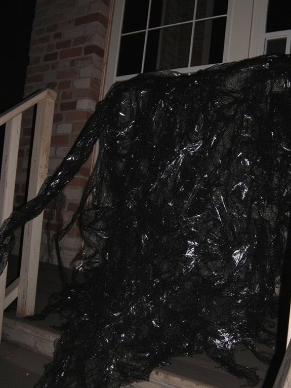 The technique involves cutting a large square from a black trash bag, creating uneven strips to mimic web patterns, then twisting and securing them with tape. Adding plastic spiders enhances the effect, making these webs an affordable yet striking addition to any Halloween decor.