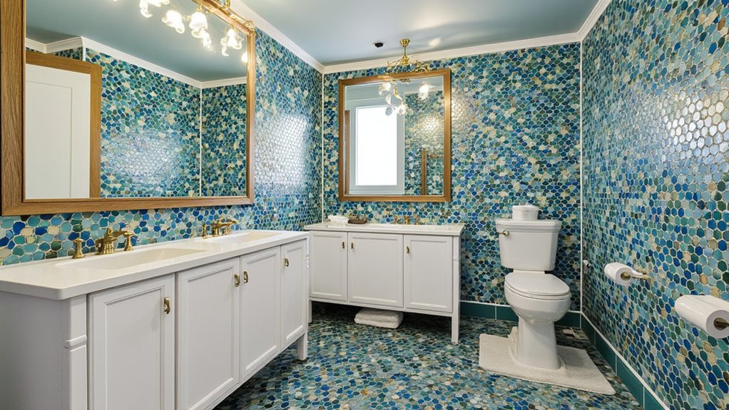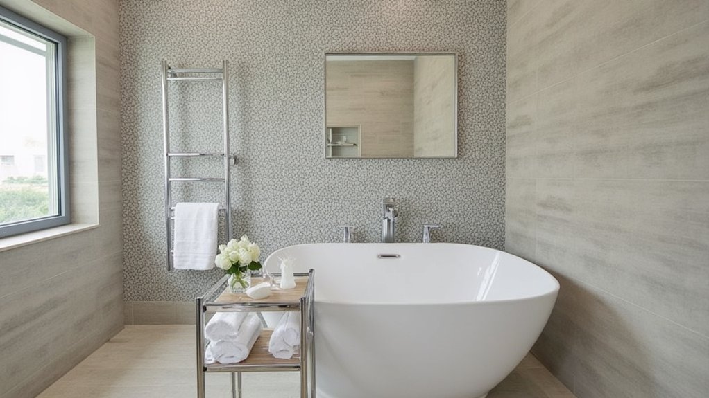While transforming your bathroom, consider artistic mosaic wallpaper to create a stunning, unique look with intricate designs. You’ll love how it mimics tiny tiles, adding depth without the grout hassle. Pick a 12×12 inch repeat pattern for small spaces, installable in 4-6 hours over a weekend.