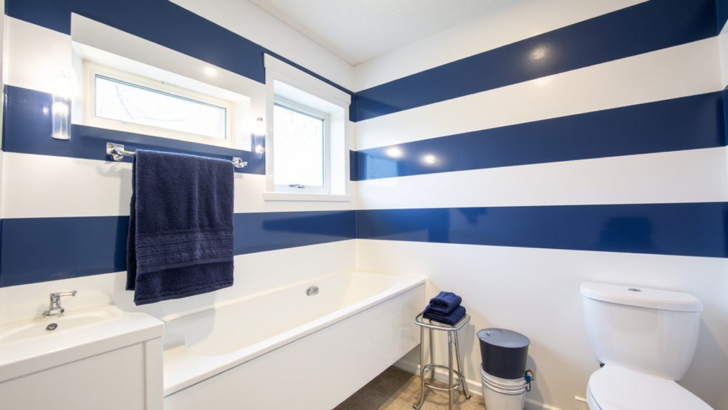 Switching gears from the gentle charm of vintage florals, let’s explore bold nautical stripes for your bathroom. You can create a crisp, coastal vibe with wide stripes in navy and white, instantly revitalizing your space. Install the wallpaper on a single 8×10-foot accent wall to avoid overwhelming the room.
