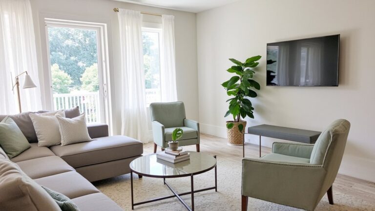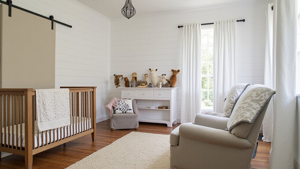 While dreaming up a cozy nursery, consider crafting a Rustic Farmhouse Theme that blends warmth with timeless charm. You’ll create a soothing space with natural textures and soft tones over a 2-3 week setup. Start with these emotional touches: