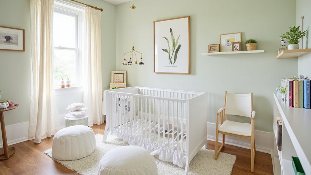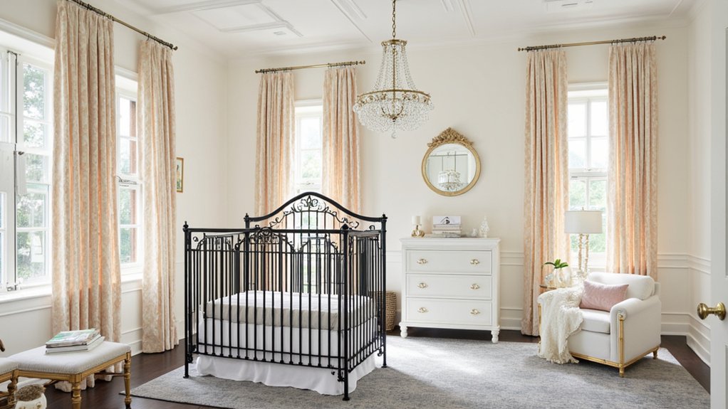 Moving from the cozy charm of a farmhouse nursery, let’s explore the sophistication of an Elegant Parisian Theme. Imagine transforming your baby’s room into a chic French haven with soft elegance. You’ll use muted pastels—think blush pink and cream—on walls for a calming vibe.