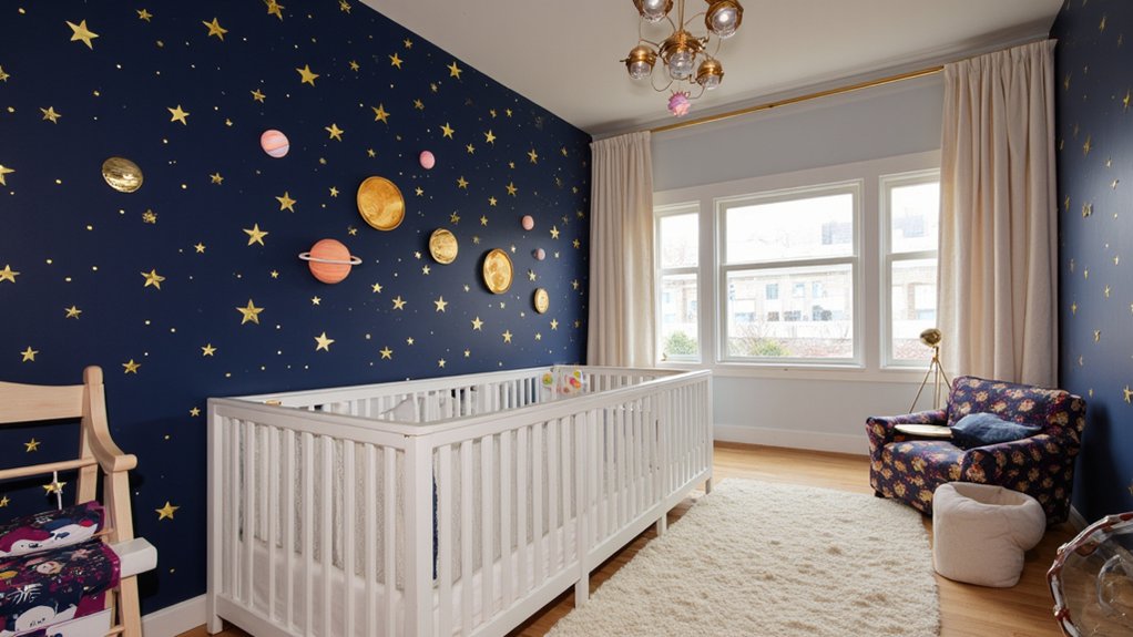 As you venture into designing a Celestial Galaxy Theme for your nursery, picture a dreamy cosmic escape. You’re creating a space that inspires wonder with deep navy walls and starlit accents. Paint a 10×10-foot accent wall in midnight blue within two days for a bold backdrop.