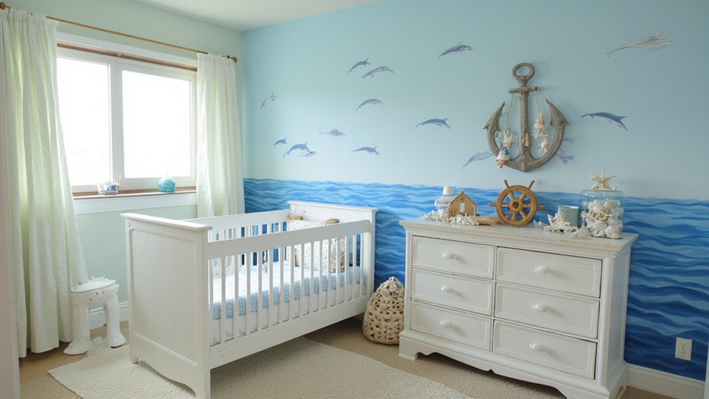 Immerse yourself in the Nautical Ocean Theme to craft a serene, sea-inspired nursery for your little one. Picture soft blues and sandy beige walls, transforming the room into a tranquil seaside escape. Install a 5×7-foot ocean mural on one wall within two days for instant depth.