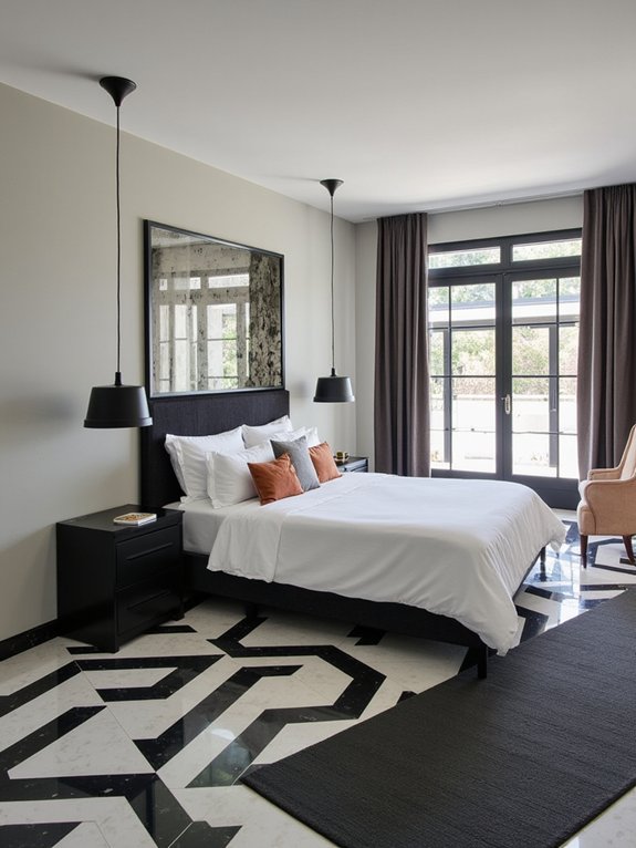 The strategic use of black tile patterns can elevate a bedroom’s overall design while complementing multiple decor styles. Large-format patterns make spaces feel bigger, while intricate mosaics add contemporary sophistication. These versatile flooring options transform ordinary rooms into striking design statements.