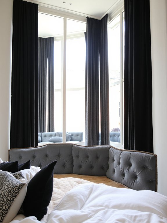 Black window treatments make a bold design statement while serving essential light control functions in bedroom spaces. Whether using velvet panels, geometric roller shades, layered sheers, or horizontal blinds, dark window coverings create dramatic contrast and sophisticated ambiance.