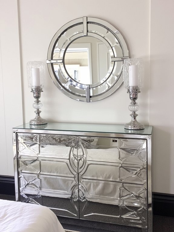 For maximum impact, position the dresser opposite windows to enhance natural light reflection throughout the room. Complete the classic Art Deco look by incorporating matching mirrored nightstands, creating a harmonious and luxurious bedroom ensemble that captures the era’s signature style.