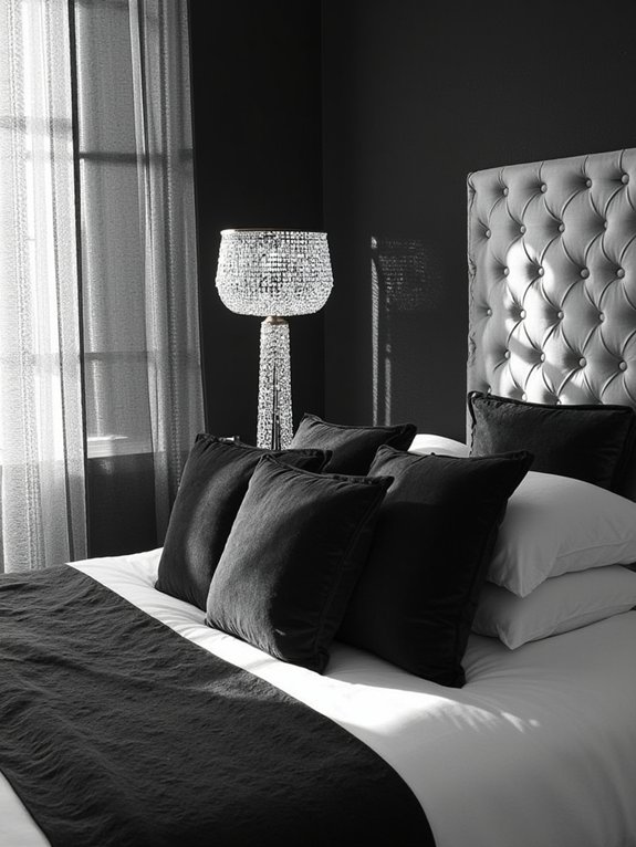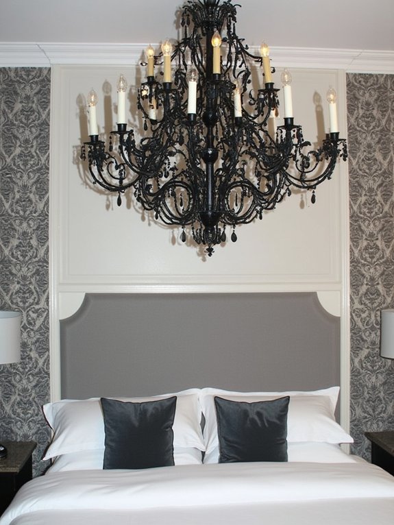 A black chandelier mounted above the bed creates a dramatic focal point while adding sophistication to any bedroom design. This statement lighting fixture helps define the sleeping area while providing ambient illumination, with options ranging from ornate Victorian crystal styles to sleek modern geometric designs.