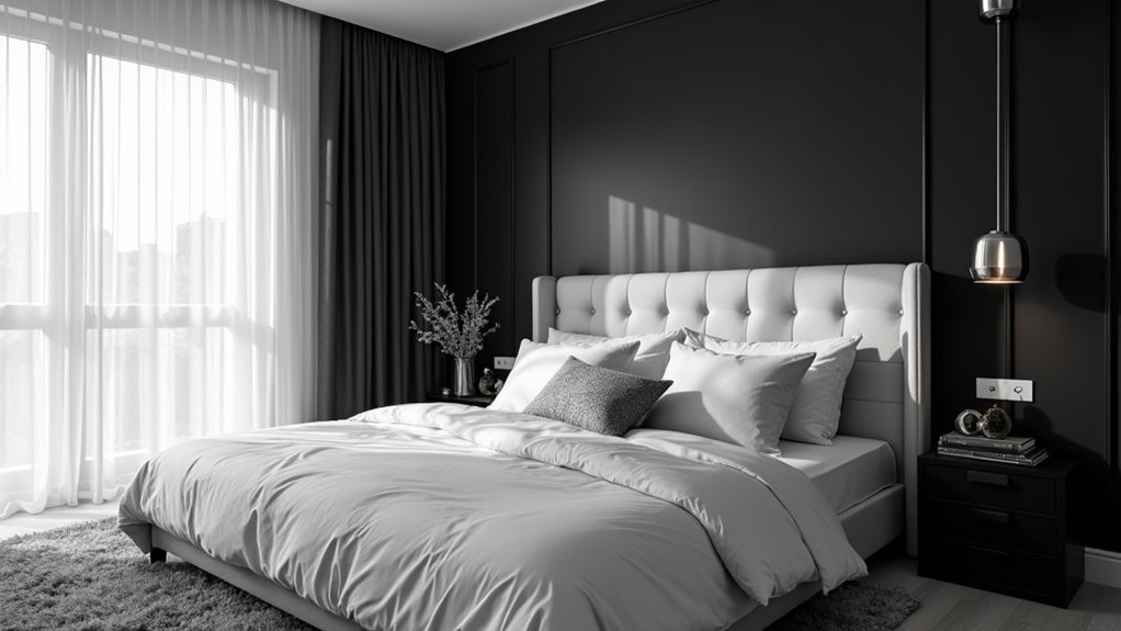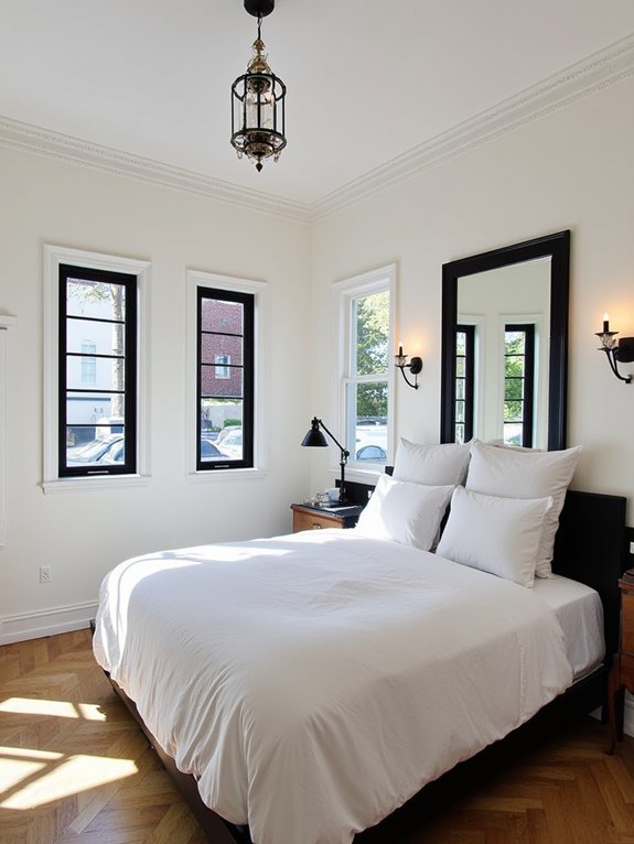White painted walls paired with black trim create a dramatic yet elegant contrast in any bedroom. This classic color combination highlights architectural details while establishing a sophisticated visual framework that makes other design elements pop.