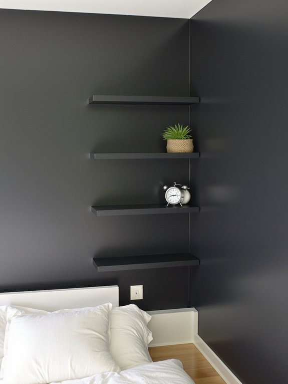 Black floating bedside shelves blend modern functionality with minimalist design, providing a sleek storage solution that saves valuable floor space. These wall-mounted platforms create an elegant, weightless appearance while offering practical surface area for essential bedside items.