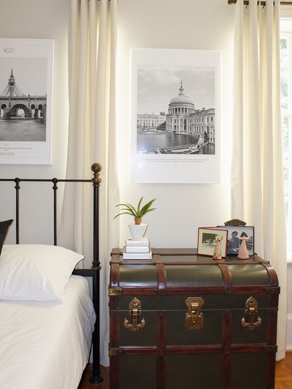 A black vintage steamer trunk brings classic sophistication and practical storage to contemporary bedroom spaces. With its rich dark finish and traditional craftsmanship, this piece serves as both a functional storage solution and a striking decorative element that enhances any room’s aesthetic.