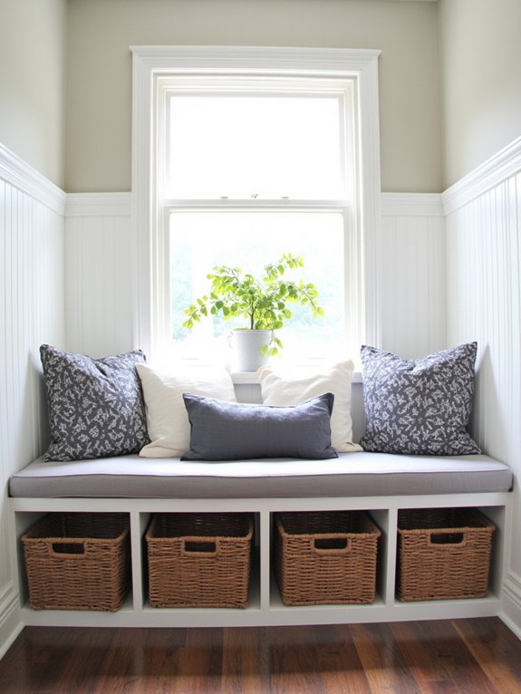 Transform unused window space into a functional storage bench that doubles as cozy seating. The custom-built unit combines comfortable cushioned seating with hidden storage compartments underneath, perfect for seasonal items, extra bedding, or books. The bench creates an inviting reading nook while maximizing space efficiency.