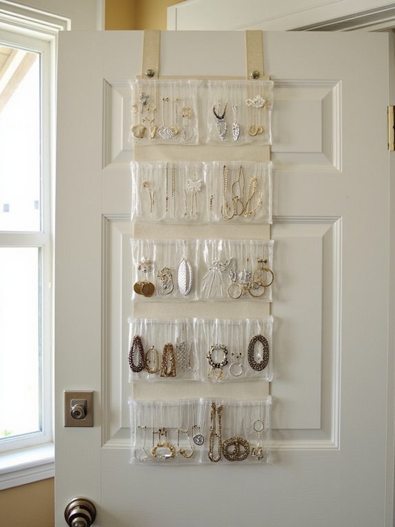Door-mounted jewelry organizers transform unused vertical door space into efficient storage solutions, perfect for small bedrooms. These organizers keep necklaces, bracelets, earrings, and other accessories neatly arranged and easily accessible without taking up valuable floor or drawer space.
